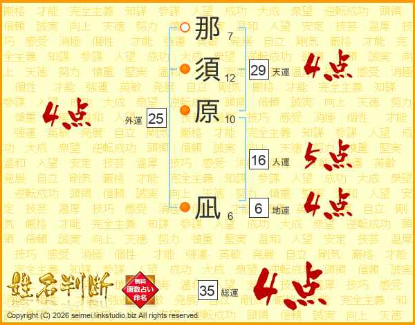 家系が持つ宿命的な運勢を表します。祖先から受け継いだ苗字ですので自分の力が及びません。家柄を象徴します。苗字の合計画数。
