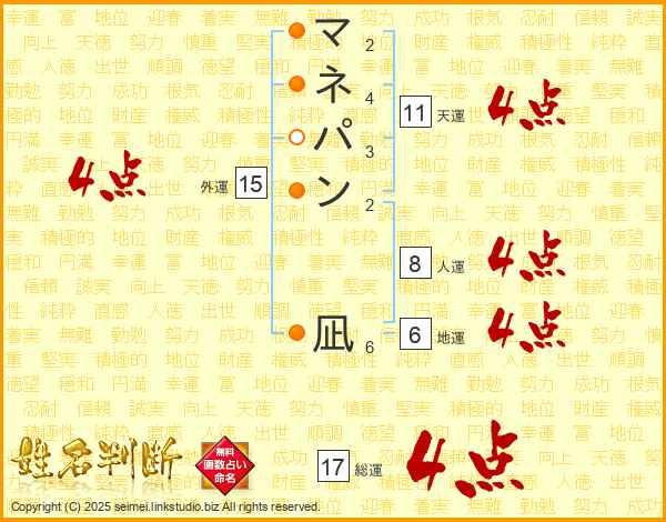 生活面を象徴する運勢です。外部から受ける影響力を表し、結婚運、家庭運や職場、環境への順応性を表します。総運から人運を引いた画数。姓や名が1文字の場合を除く。
