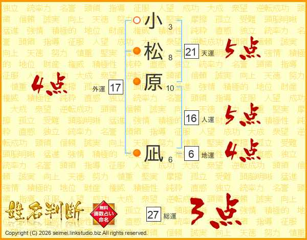生活面を象徴する運勢です。外部から受ける影響力を表し、結婚運、家庭運や職場、環境への順応性を表します。総運から人運を引いた画数。姓や名が1文字の場合を除く。