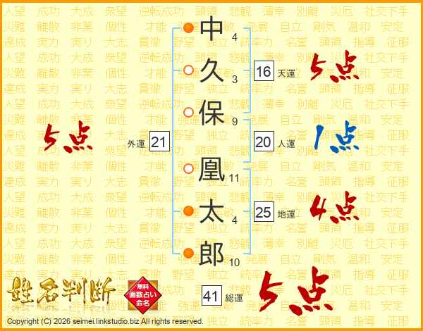 中(4画)久(3画)保(9画) 凰(11画)太(4画)郎(10画)