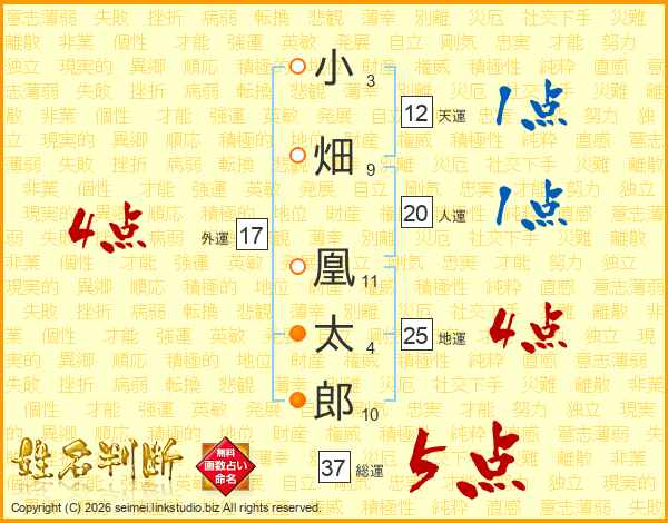 小畑凰太郎さんの総運は37画の5点!
