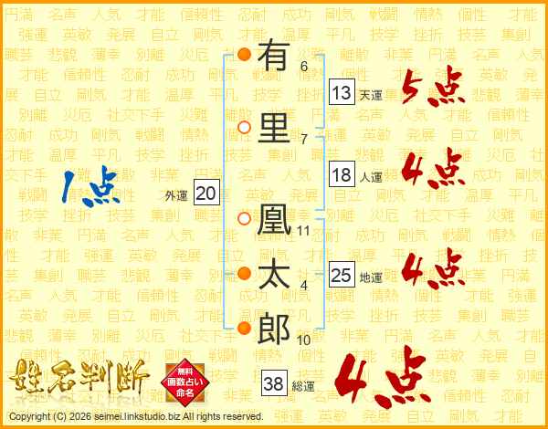 有(6画)里(7画) 凰(11画)太(4画)郎(10画)