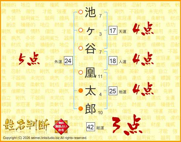 池ヶ谷凰太郎さんの地運は25画の4点!