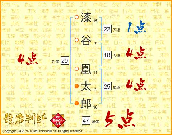 漆(15画)谷(7画) 凰(11画)太(4画)郎(10画)
