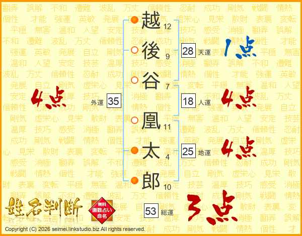 越(12画)後(9画)谷(7画) 凰(11画)太(4画)郎(10画)