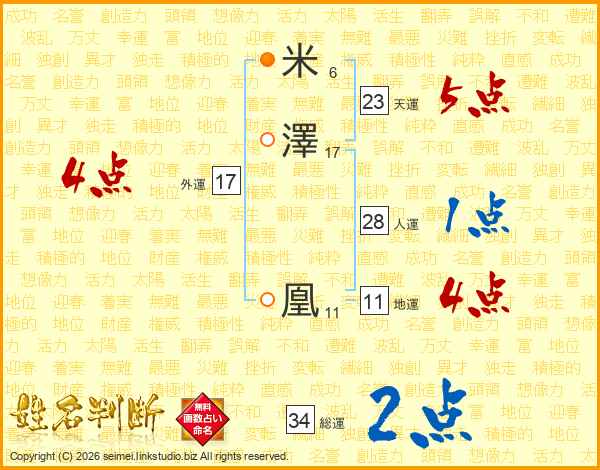 米(6画)澤(17画) 凰(11画)