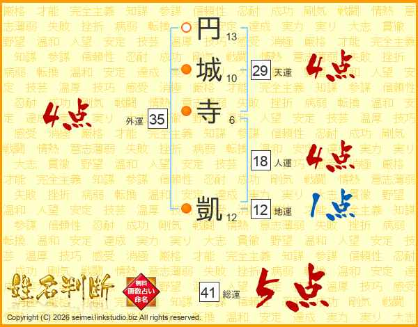 生活面を象徴する運勢です。外部から受ける影響力を表し、結婚運、家庭運や職場、環境への順応性を表します。総運から人運を引いた画数。姓や名が1文字の場合を除く。