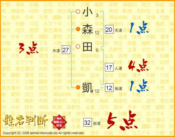 小森田凱さんの総運は32画の5点!