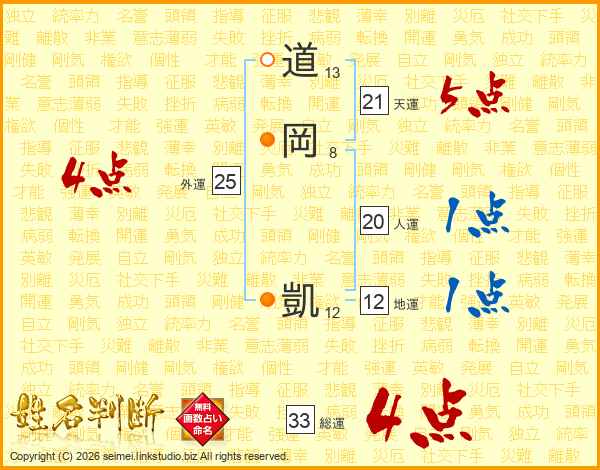 生活面を象徴する運勢です。外部から受ける影響力を表し、結婚運、家庭運や職場、環境への順応性を表します。総運から人運を引いた画数。姓や名が1文字の場合を除く。
