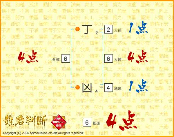 生活面を象徴する運勢です。外部から受ける影響力を表し、結婚運、家庭運や職場、環境への順応性を表します。総運から人運を引いた画数。姓や名が1文字の場合を除く。