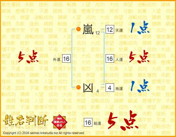 生活面を象徴する運勢です。外部から受ける影響力を表し、結婚運、家庭運や職場、環境への順応性を表します。総運から人運を引いた画数。姓や名が1文字の場合を除く。