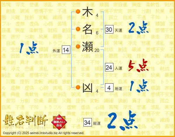 木(4画)名(6画)瀬(20画) 凶(4画)