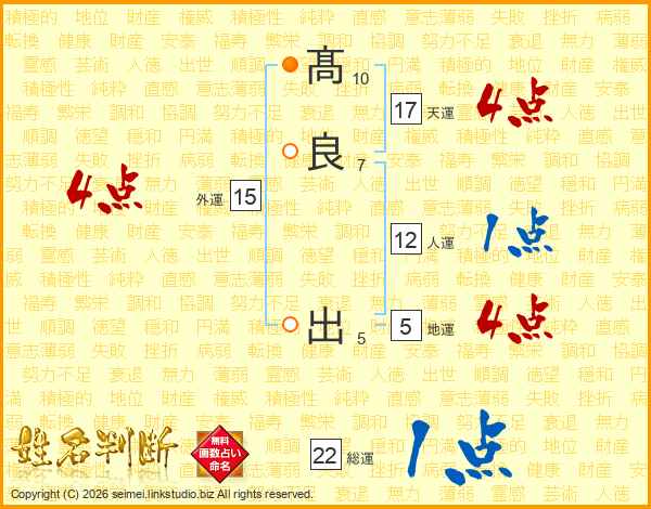 生活面を象徴する運勢です。外部から受ける影響力を表し、結婚運、家庭運や職場、環境への順応性を表します。総運から人運を引いた画数。姓や名が1文字の場合を除く。