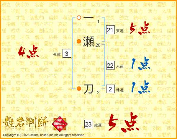 一瀬刀さんの総運は23画の5点!