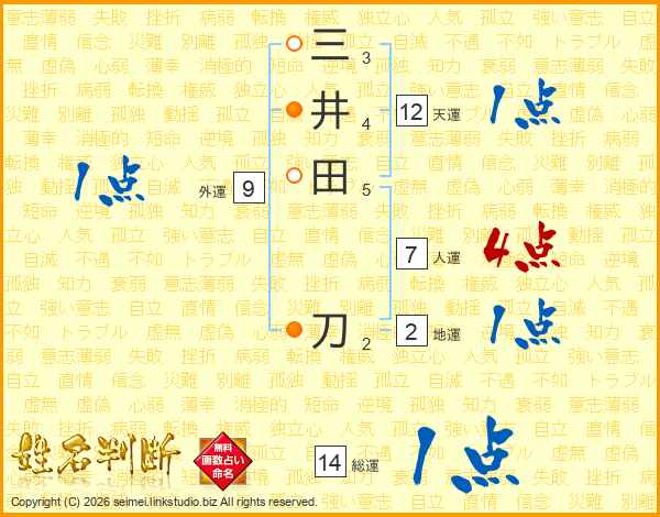 生活面を象徴する運勢です。外部から受ける影響力を表し、結婚運、家庭運や職場、環境への順応性を表します。総運から人運を引いた画数。姓や名が1文字の場合を除く。