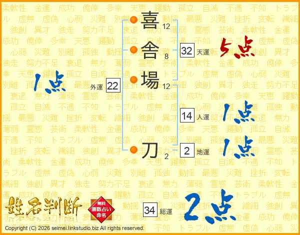 喜(12画)舎(8画)場(12画) 刀(2画)