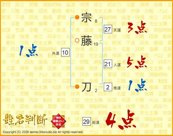 宗藤刀さんの総運は29画の4点!
