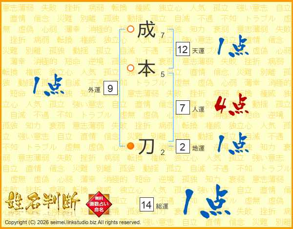 成本刀さんの人運は7画の4点!