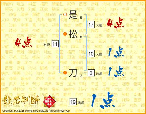 生活面を象徴する運勢です。外部から受ける影響力を表し、結婚運、家庭運や職場、環境への順応性を表します。総運から人運を引いた画数。姓や名が1文字の場合を除く。