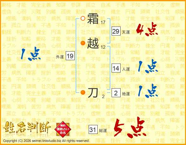 生活面を象徴する運勢です。外部から受ける影響力を表し、結婚運、家庭運や職場、環境への順応性を表します。総運から人運を引いた画数。姓や名が1文字の場合を除く。