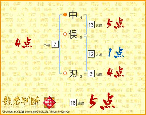 中俣刃さんの天運は13画の5点!