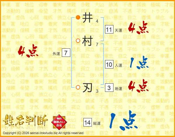 生活面を象徴する運勢です。外部から受ける影響力を表し、結婚運、家庭運や職場、環境への順応性を表します。総運から人運を引いた画数。姓や名が1文字の場合を除く。