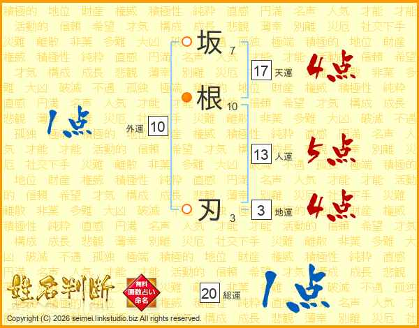 生活面を象徴する運勢です。外部から受ける影響力を表し、結婚運、家庭運や職場、環境への順応性を表します。総運から人運を引いた画数。姓や名が1文字の場合を除く。