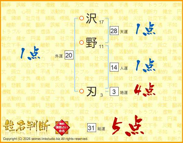 沢野刃さんの総運は31画の5点!