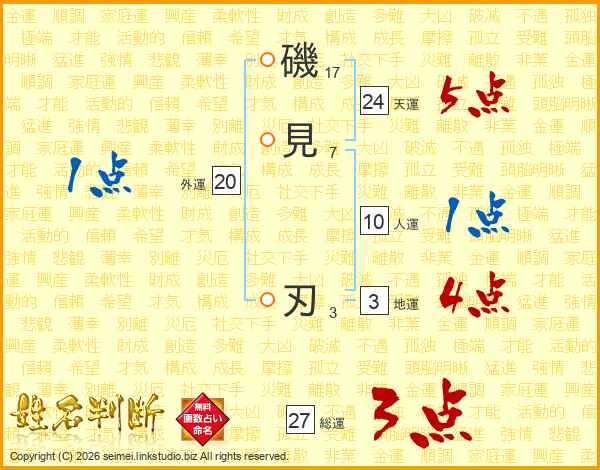 磯見刃さんの総運は27画の3点!