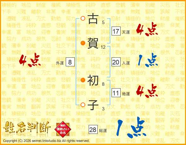 古(5画)賀(12画) 初(8画)子(3画)