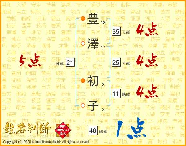 生活面を象徴する運勢です。外部から受ける影響力を表し、結婚運、家庭運や職場、環境への順応性を表します。総運から人運を引いた画数。姓や名が1文字の場合を除く。