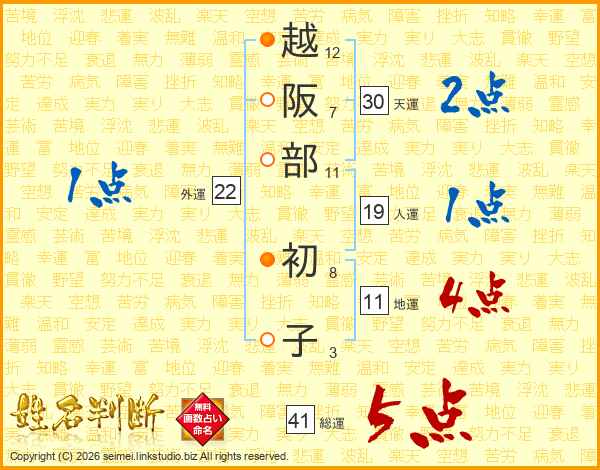 越(12画)阪(7画)部(11画) 初(8画)子(3画)
