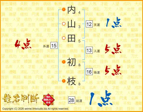 内(4画)山(3画)田(5画) 初(8画)枝(8画)