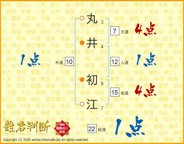 生活面を象徴する運勢です。外部から受ける影響力を表し、結婚運、家庭運や職場、環境への順応性を表します。総運から人運を引いた画数。姓や名が1文字の場合を除く。