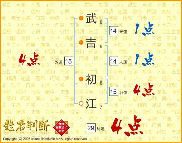 生活面を象徴する運勢です。外部から受ける影響力を表し、結婚運、家庭運や職場、環境への順応性を表します。総運から人運を引いた画数。姓や名が1文字の場合を除く。