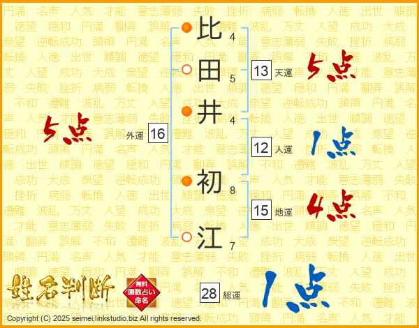 比(4画)田(5画)井(4画) 初(8画)江(7画)