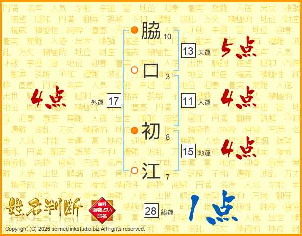脇(10画)口(3画) 初(8画)江(7画)