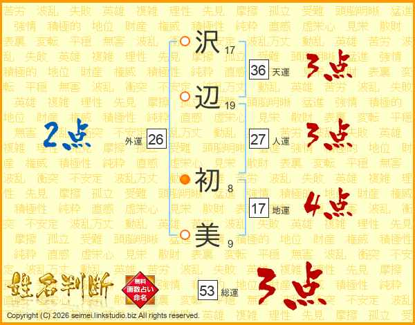 沢(17画)辺(19画) 初(8画)美(9画)