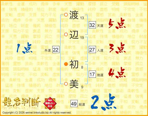 渡(13画)辺(19画) 初(8画)美(9画)