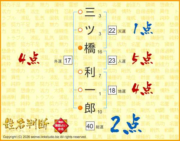 三(3画)ツ(3画)橋(16画) 利(7画)一(1画)郎(10画)