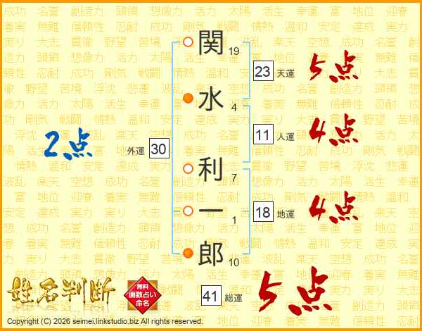 関(19画)水(4画) 利(7画)一(1画)郎(10画)
