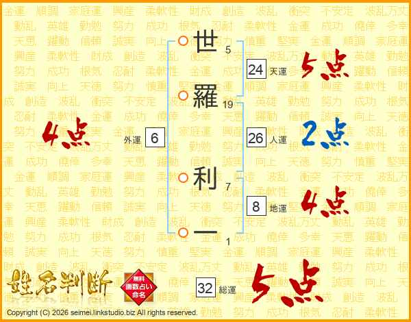 世羅利一さんの総運は32画の5点!