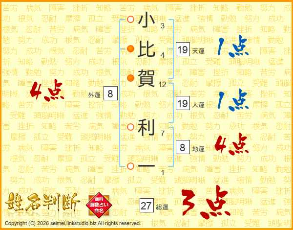 小(3画)比(4画)賀(12画) 利(7画)一(1画)