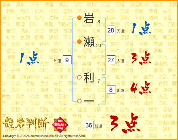 岩(8画)瀬(20画) 利(7画)一(1画)