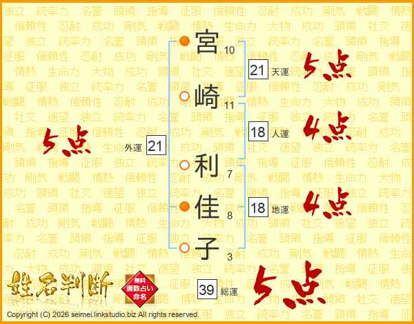 宮崎利佳子さんの総運は39画の5点!