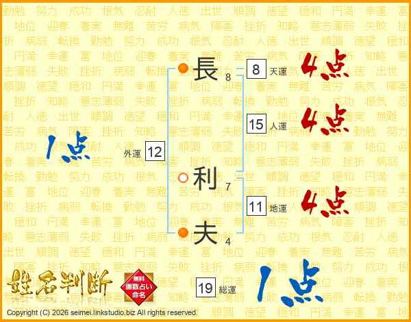 あなたの人生を表す1番重要な運勢です。生涯を通じて影響する総合運となり、主に50歳以降の晩年期に影響を及ぼします。苗字と名前の合計画数。