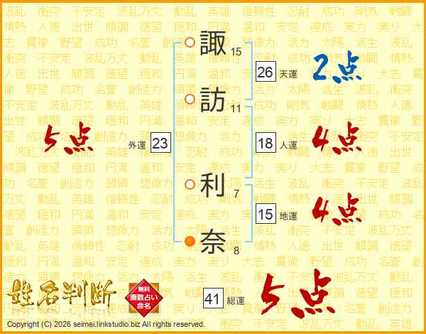 諏(15画)訪(11画) 利(7画)奈(8画)
