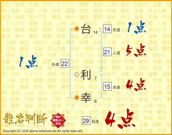 生活面を象徴する運勢です。外部から受ける影響力を表し、結婚運、家庭運や職場、環境への順応性を表します。総運から人運を引いた画数。姓や名が1文字の場合を除く。