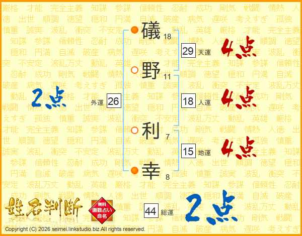 生活面を象徴する運勢です。外部から受ける影響力を表し、結婚運、家庭運や職場、環境への順応性を表します。総運から人運を引いた画数。姓や名が1文字の場合を除く。