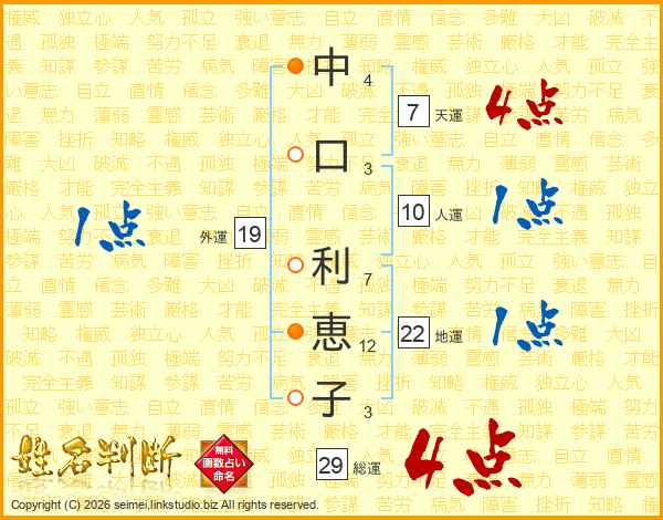 中(4画)口(3画) 利(7画)恵(12画)子(3画)